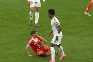 比赛第9分钟,维尼修斯拼抢时先是绊倒了基米希,然后又上手将本就倒地的后者一把推翻,被裁判口头警告。