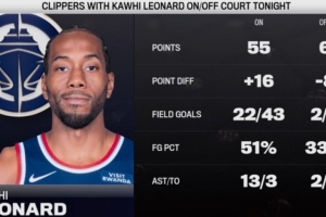 据统计,上半场比赛中,小卡在场时快船正负值+16,期间球队投篮命中率51%;下场后为-8,期间球队投篮命中率33%。