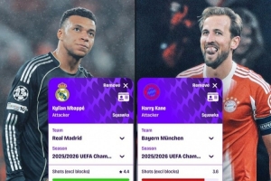 姆巴佩、凯恩欧冠每90分钟数据:射门4.4比3.6,进球1.6比1.4