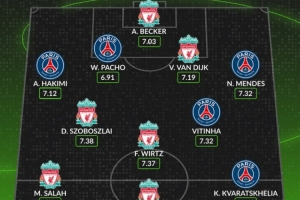 本赛季欧冠利物浦+巴黎评分最高阵:索博、维尔茨、K77在列