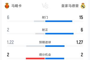 皇马0-1马略卡全场数据:射门15-6,马略卡2射正皆转化为进球